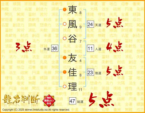 東(8画)風(9画)谷(7画) 友(4画)佳(8画)理(11画)