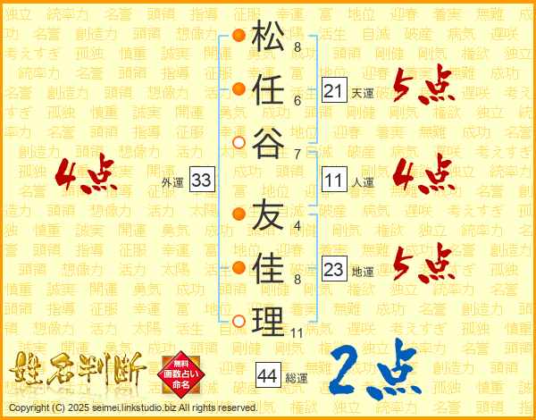 松(8画)任(6画)谷(7画) 友(4画)佳(8画)理(11画)