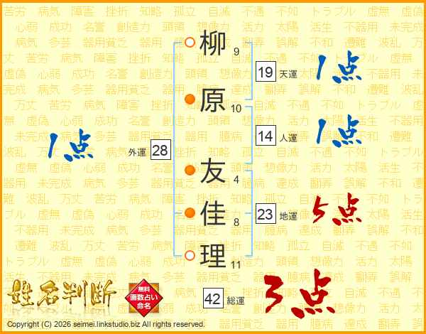 柳(9画)原(10画) 友(4画)佳(8画)理(11画)