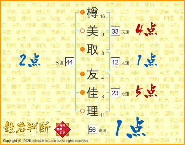 樽(16画)美(9画)取(8画) 友(4画)佳(8画)理(11画)