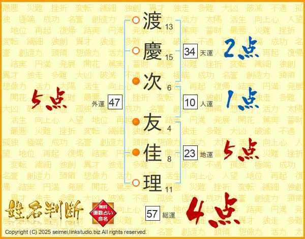 渡(13画)慶(15画)次(6画) 友(4画)佳(8画)理(11画)