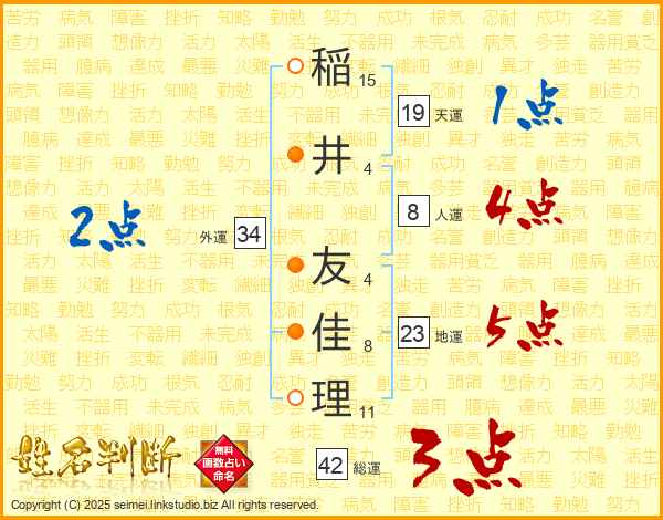 稲(15画)井(4画) 友(4画)佳(8画)理(11画)
