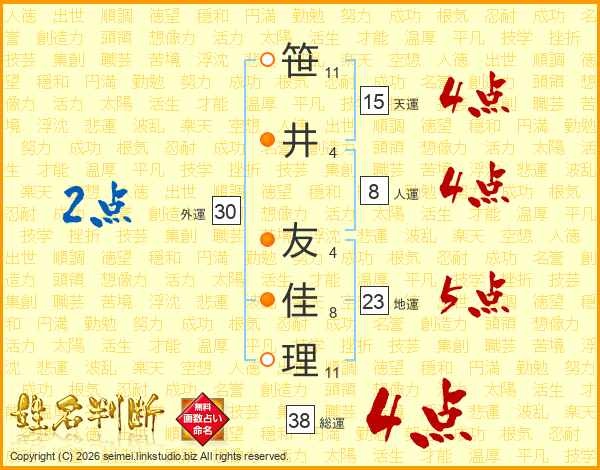 笹(11画)井(4画) 友(4画)佳(8画)理(11画)
