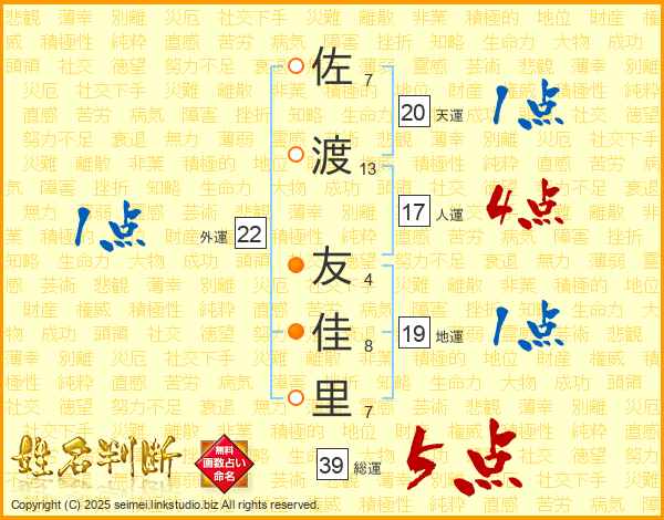 佐(7画)渡(13画) 友(4画)佳(8画)里(7画)