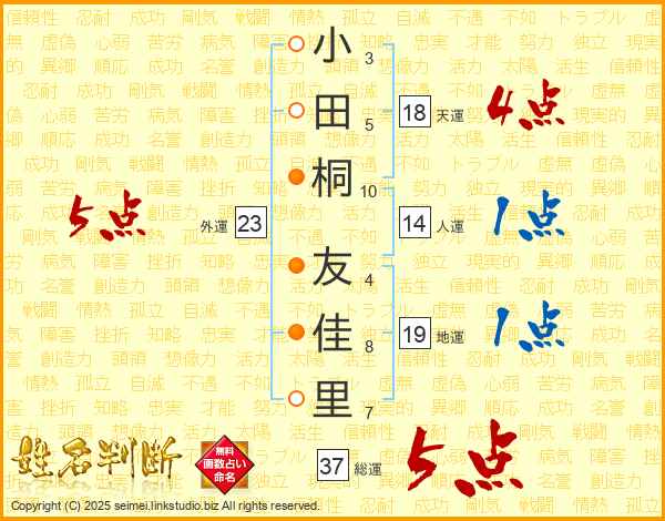 小田桐友佳里さんの総運は37画の5点!