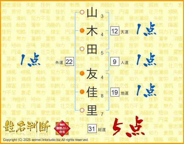 山(3画)木(4画)田(5画) 友(4画)佳(8画)里(7画)