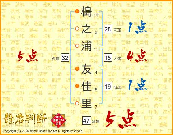 槝(14画)之(3画)浦(11画) 友(4画)佳(8画)里(7画)