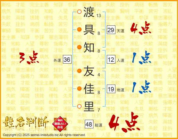 渡(13画)具(8画)知(8画) 友(4画)佳(8画)里(7画)