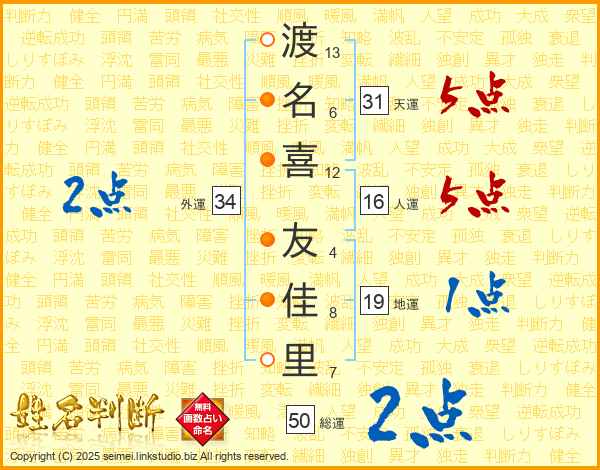 渡(13画)名(6画)喜(12画) 友(4画)佳(8画)里(7画)