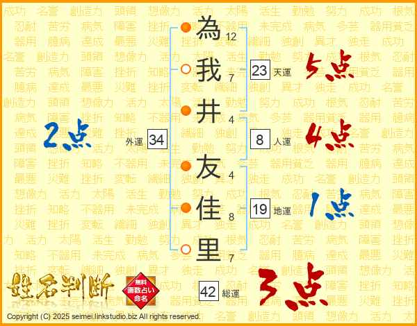 為(12画)我(7画)井(4画) 友(4画)佳(8画)里(7画)