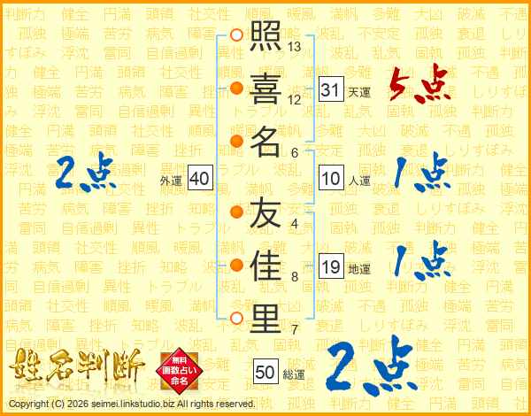 照(13画)喜(12画)名(6画) 友(4画)佳(8画)里(7画)