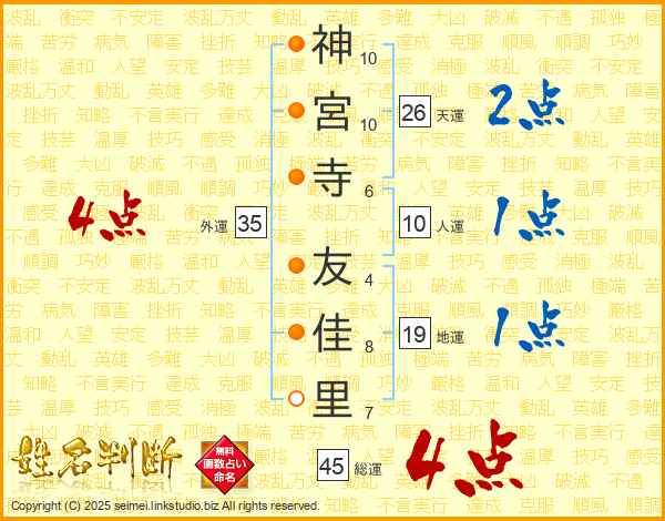 神(10画)宮(10画)寺(6画) 友(4画)佳(8画)里(7画)