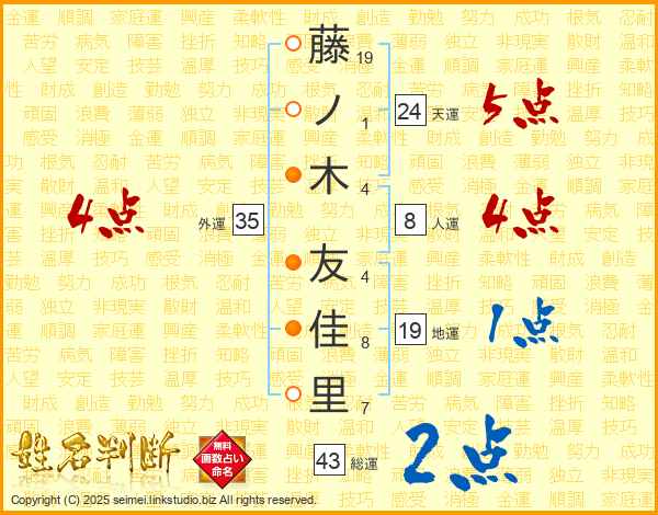 藤(19画)ノ(1画)木(4画) 友(4画)佳(8画)里(7画)