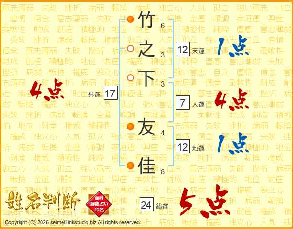 竹(6画)之(3画)下(3画) 友(4画)佳(8画)