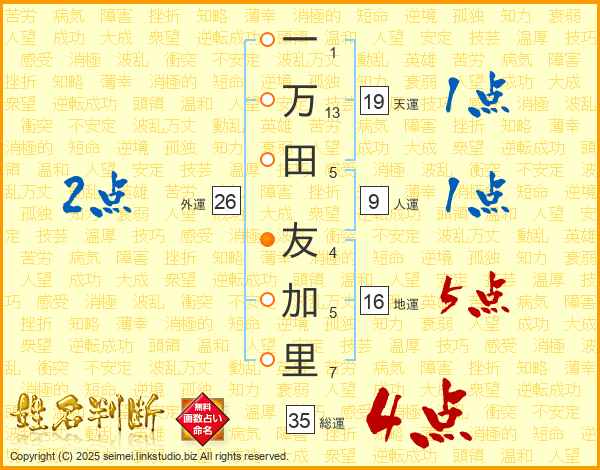 一(1画)万(13画)田(5画) 友(4画)加(5画)里(7画)