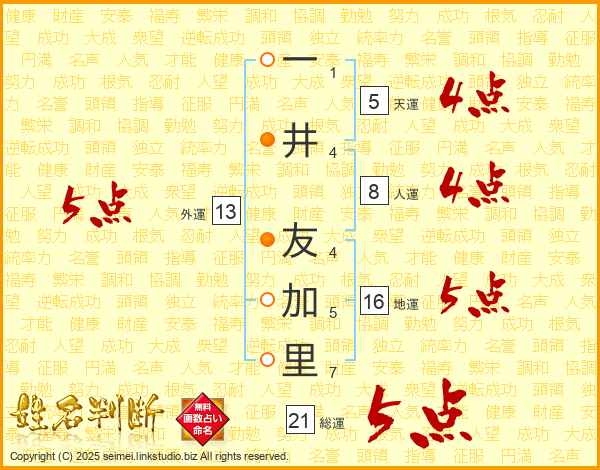 一(1画)井(4画) 友(4画)加(5画)里(7画)