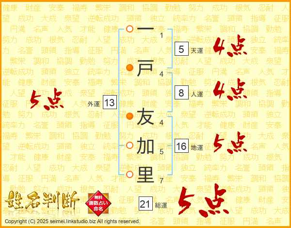 一(1画)戸(4画) 友(4画)加(5画)里(7画)