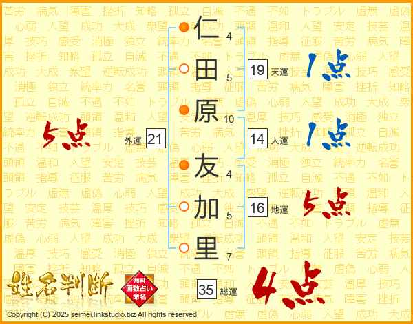 仁(4画)田(5画)原(10画)  友(4画)加(5画)里(7画)