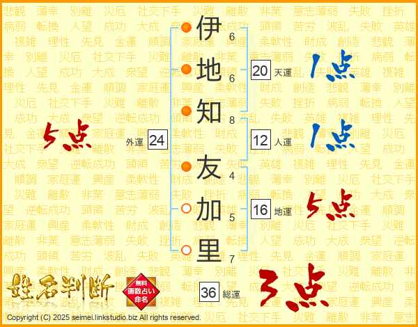 伊(6画)地(6画)知(8画) 友(4画)加(5画)里(7画)