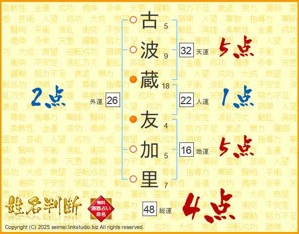 古(5画)波(9画)蔵(18画)  友(4画)加(5画)里(7画)