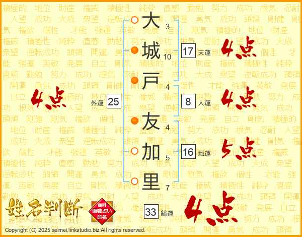 大(3画)城(10画)戸(4画) 友(4画)加(5画)里(7画)
