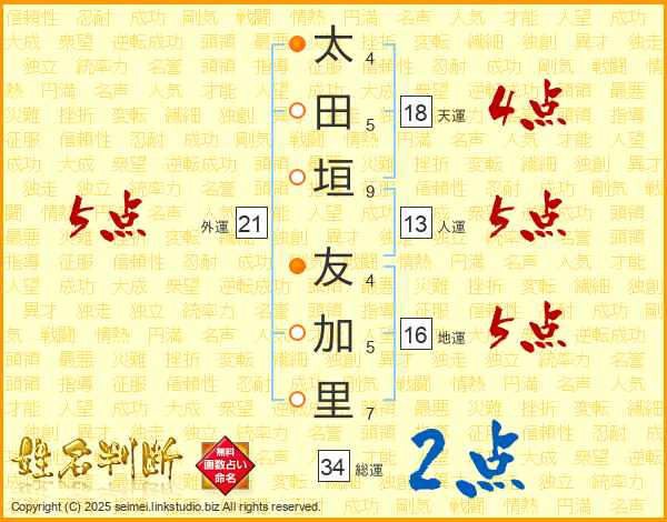 太(4画)田(5画)垣(9画) 友(4画)加(5画)里(7画)