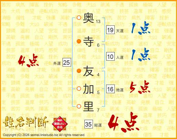 奥(13画)寺(6画) 友(4画)加(5画)里(7画)