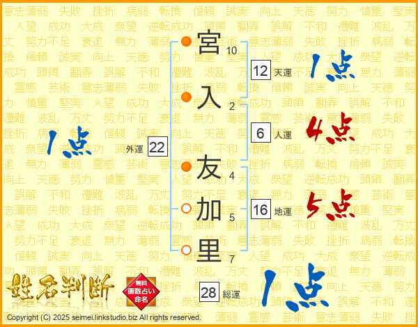 宮(10画)入(2画) 友(4画)加(5画)里(7画)