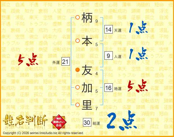 柄(9画)本(5画) 友(4画)加(5画)里(7画)