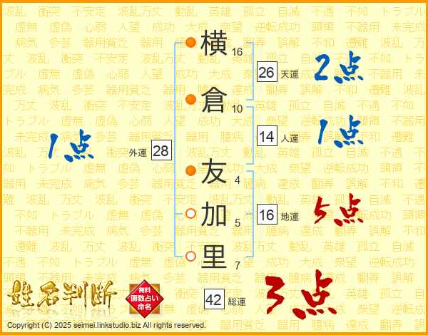 横(16画)倉(10画) 友(4画)加(5画)里(7画)