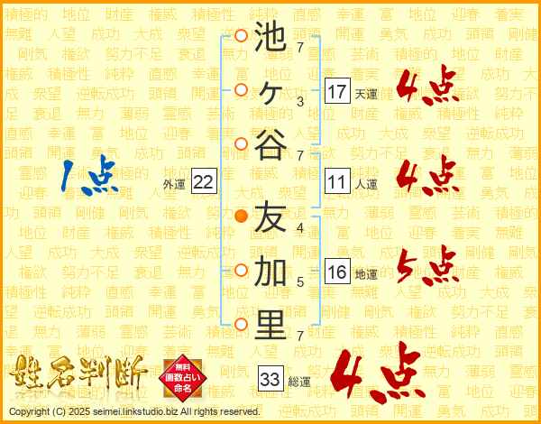 池ヶ谷友加里さんの天運は17画の4点!