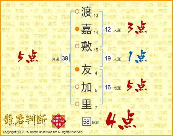 渡(13画)嘉(14画)敷(15画) 友(4画)加(5画)里(7画)