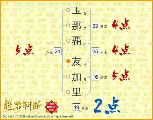 玉那覇友加里さんの総運は49画の2点!