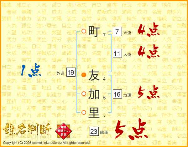 町(7画) 友(4画)加(5画)里(7画)