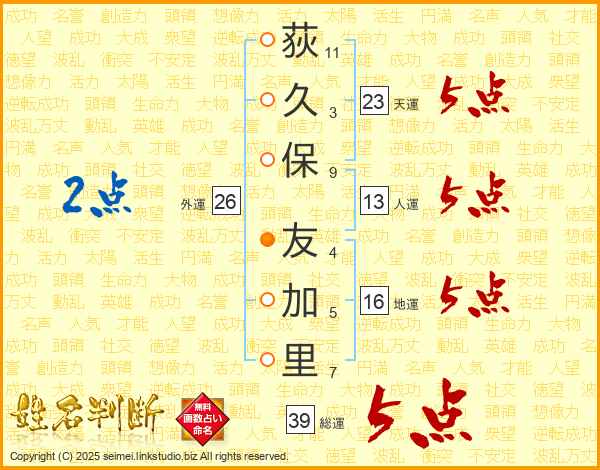 荻(11画)久(3画)保(9画) 友(4画)加(5画)里(7画)