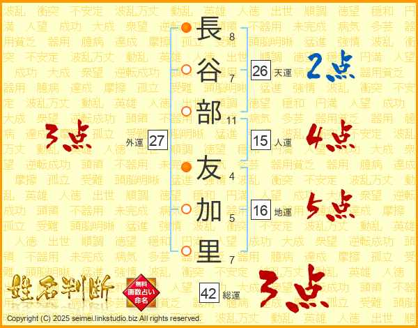 長(8画)谷(7画)部(11画)  友(4画)加(5画)里(7画)