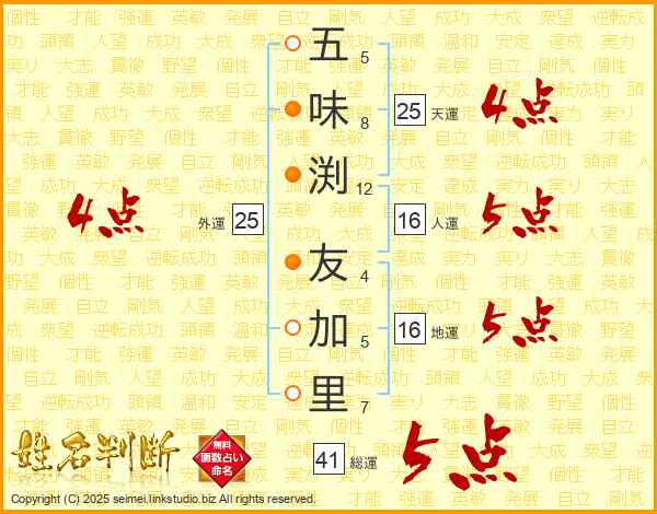 五味渕友加里さんの総運は41画の5点!