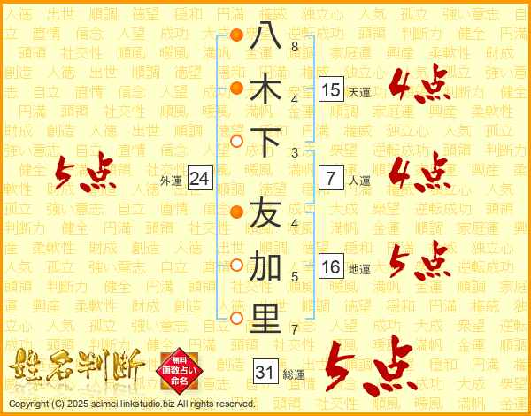 八(8画)木(4画)下(3画) 友(4画)加(5画)里(7画)