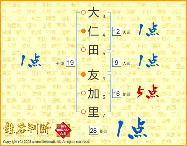 大(3画)仁(4画)田(5画) 友(4画)加(5画)里(7画)