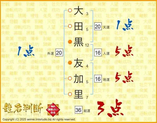 大(3画)田(5画)黒(12画) 友(4画)加(5画)里(7画)