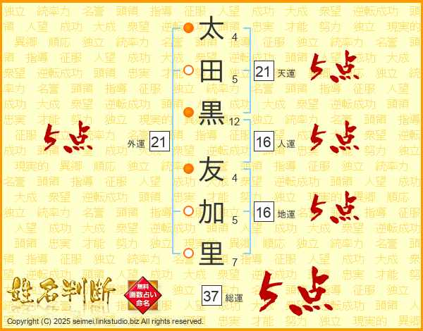 太(4画)田(5画)黒(12画) 友(4画)加(5画)里(7画)