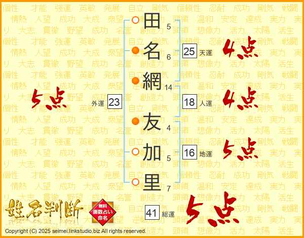 田(5画)名(6画)網(14画) 友(4画)加(5画)里(7画)