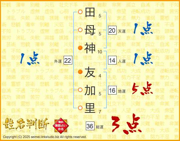 田(5画)母(5画)神(10画) 友(4画)加(5画)里(7画)