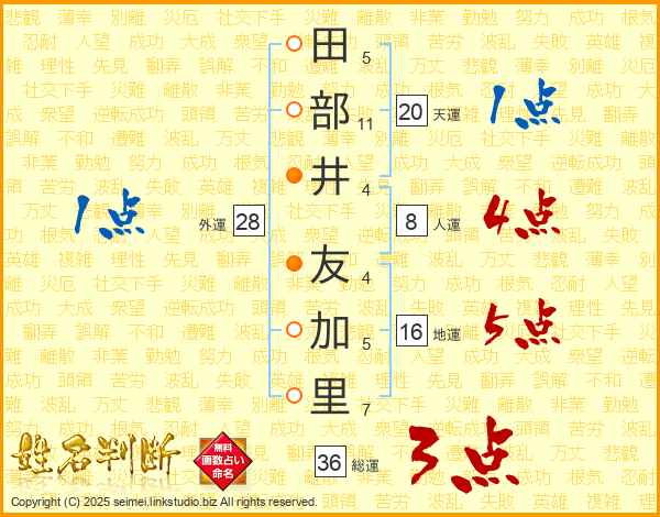 田(5画)部(11画)井(4画) 友(4画)加(5画)里(7画)