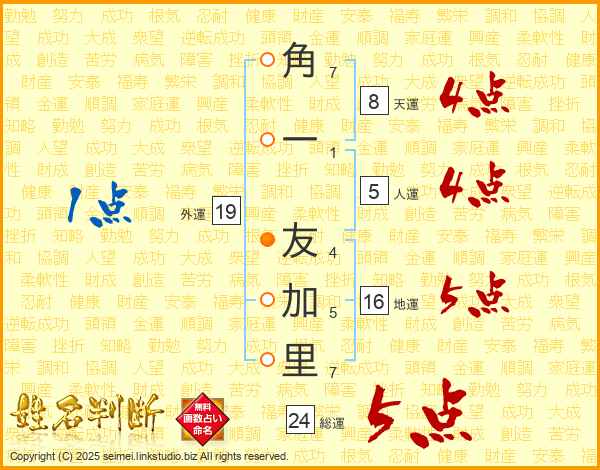 生活面を象徴する運勢です。外部から受ける影響力を表し、結婚運、家庭運や職場、環境への順応性を表します。総運から人運を引いた画数。姓や名が1文字の場合を除く。