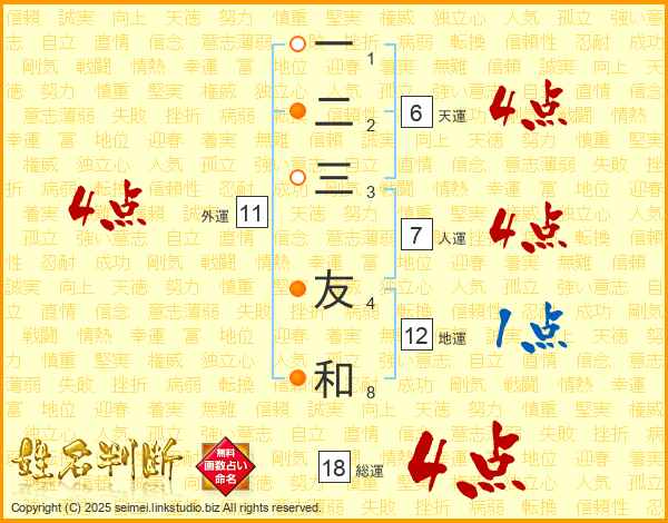 生活面を象徴する運勢です。外部から受ける影響力を表し、結婚運、家庭運や職場、環境への順応性を表します。総運から人運を引いた画数。姓や名が1文字の場合を除く。