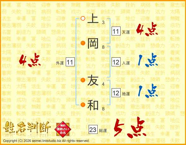 生活面を象徴する運勢です。外部から受ける影響力を表し、結婚運、家庭運や職場、環境への順応性を表します。総運から人運を引いた画数。姓や名が1文字の場合を除く。