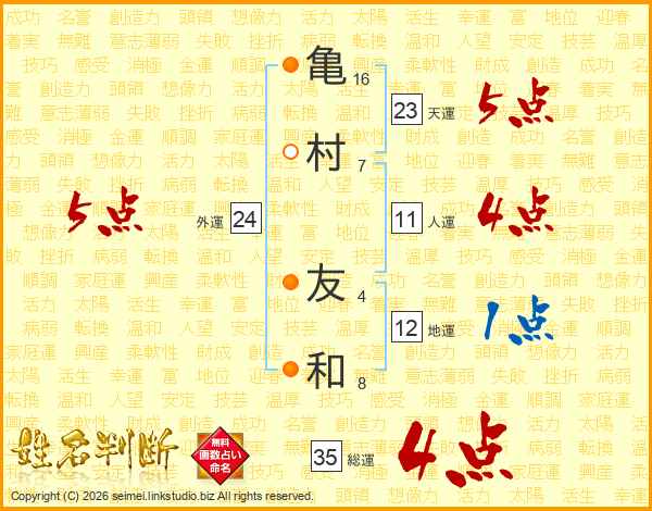 亀(16画)村(7画) 友(4画)和(8画)