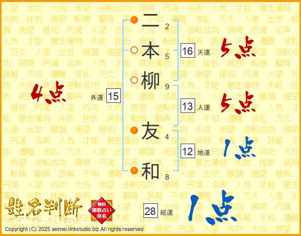 生活面を象徴する運勢です。外部から受ける影響力を表し、結婚運、家庭運や職場、環境への順応性を表します。総運から人運を引いた画数。姓や名が1文字の場合を除く。