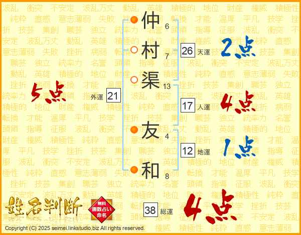 仲(6画)村(7画)渠(13画) 友(4画)和(8画)